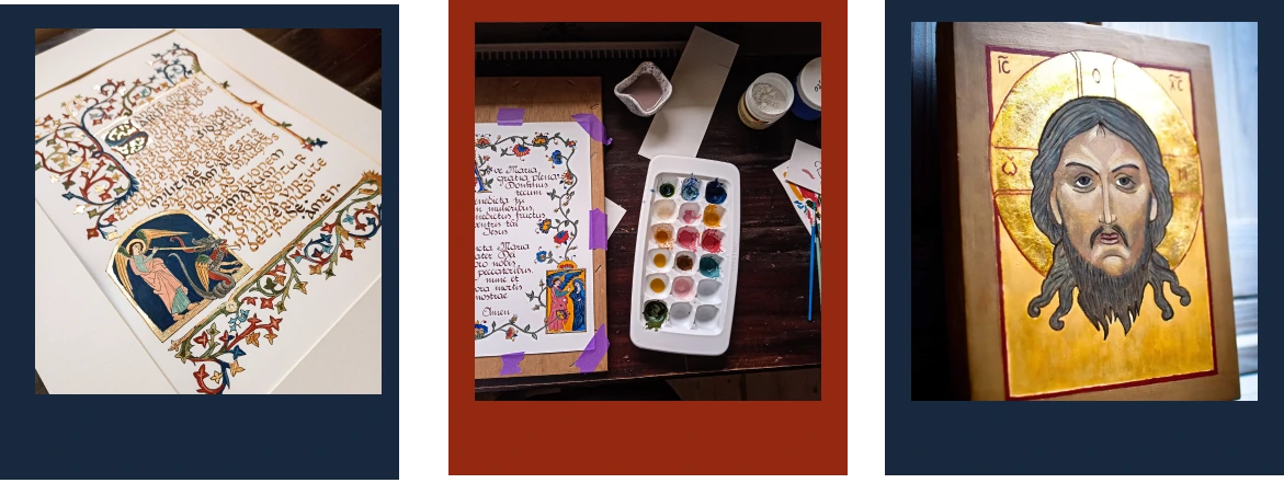Prace wykonuję tradycyjnymi technikami średniowiecznej iluminacji. Wykorzystuję naturalne , mineralne pigmenty, temperę jajeczną i prawdziwe złoto.